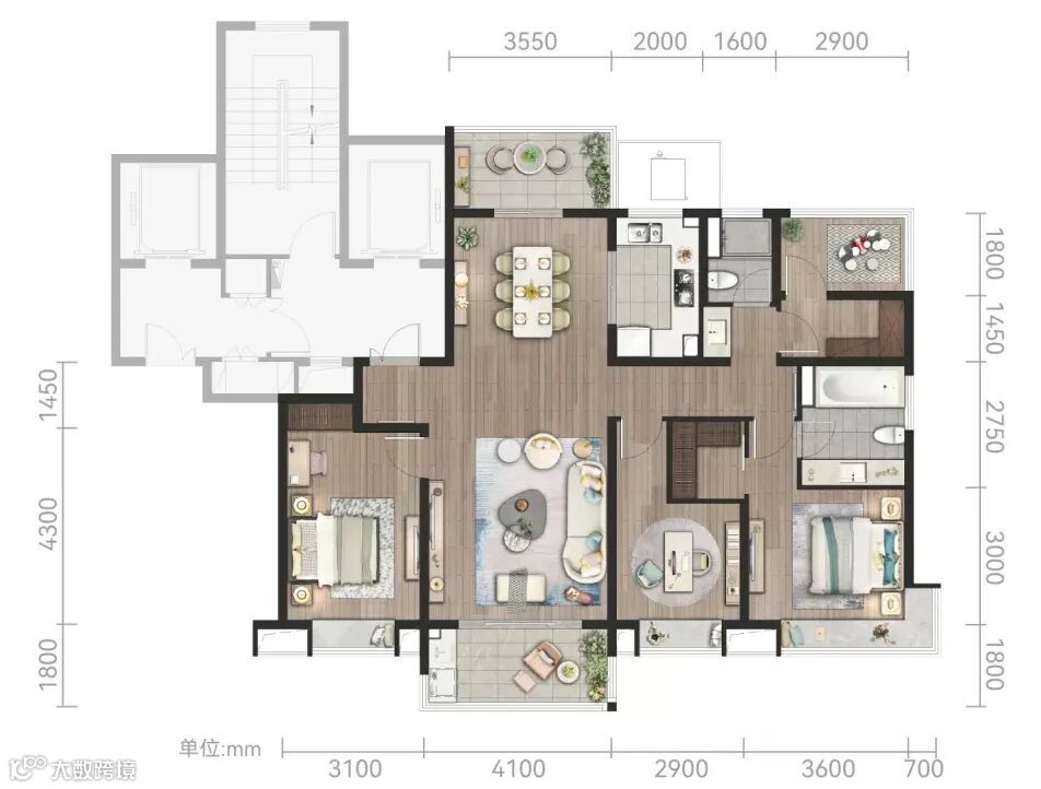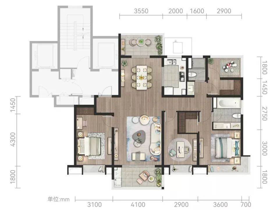 新疆万科·都会未来城洋房一梯两户,建筑面积约145㎡的户型,4房2厅2卫设计,户型方正,南北通透,几乎没有面积浪费。首先入户玄关非常有仪式感,收纳容量超大;约7.5米大宽厅,带给业主开阔的视野和舒适的居住体验。