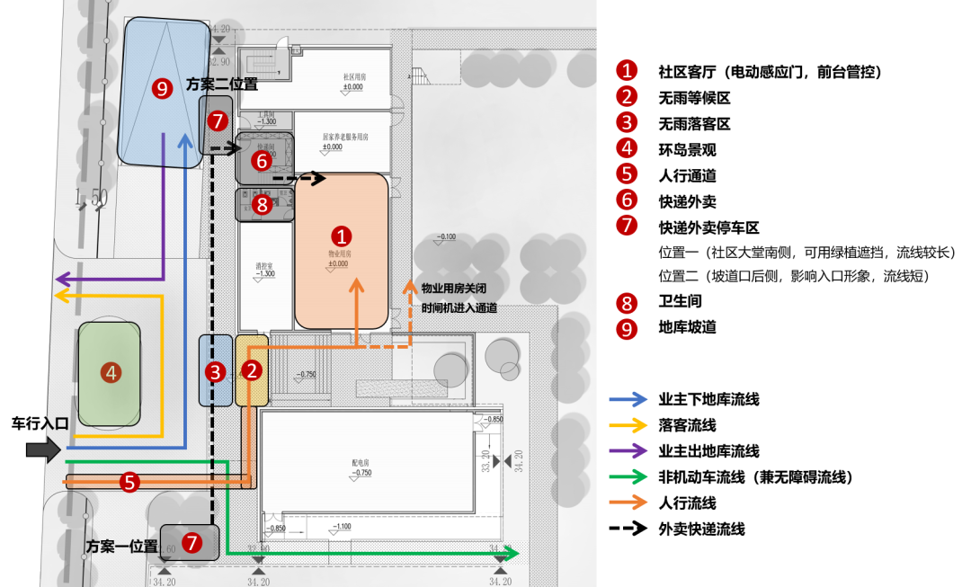 社区入口的流线经过精心规划,以实现人车分离,确保安全与便捷。人行流线的设计特别强调了仪式感的营造,让居民在步行入户的过程中首先通过社区会客厅,体验到家的温暖和社区的关怀。