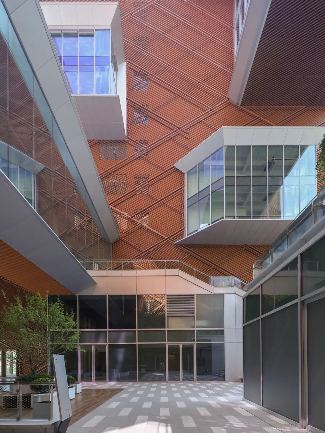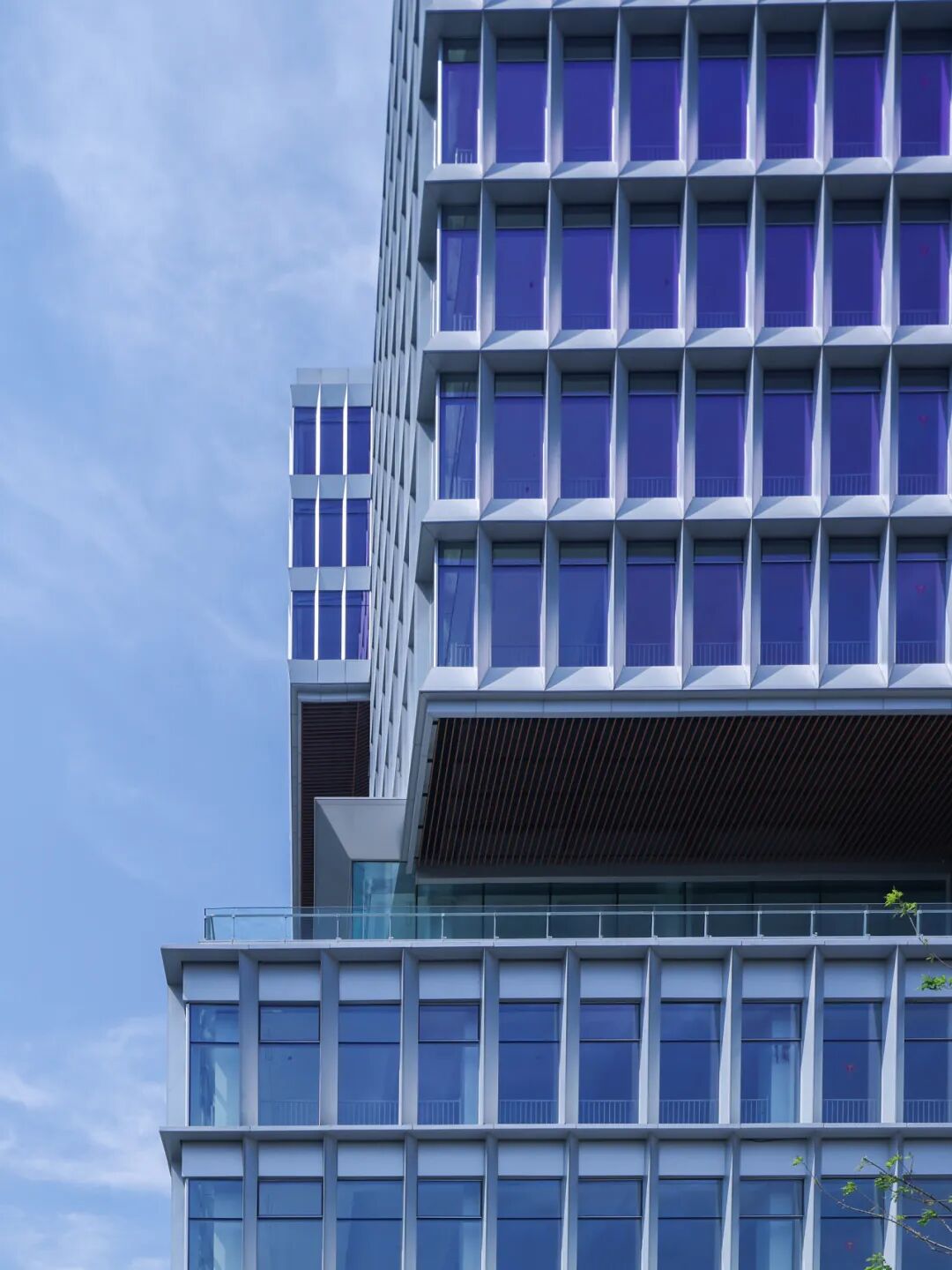 建筑采用“开放式体量”设计,建筑中部打开,形成一个巨型公共门户,欢迎公众进入庭院空间,同时门户标志着大学区入口,满足政府要求。开放的中央庭院由大型景观台阶构成,由首层连接至五层,与首两层的零售空间无缝连接, 并串连上层的办公辅助功能与户外交流空间。这个立体化的庭院空间,不仅形成了餐饮阳台、社交台阶,表演场所,知识园莆和联合办公连桥等多功能区域,同时为办公人员与小区群体创造了全新的社交与休闲体验。
