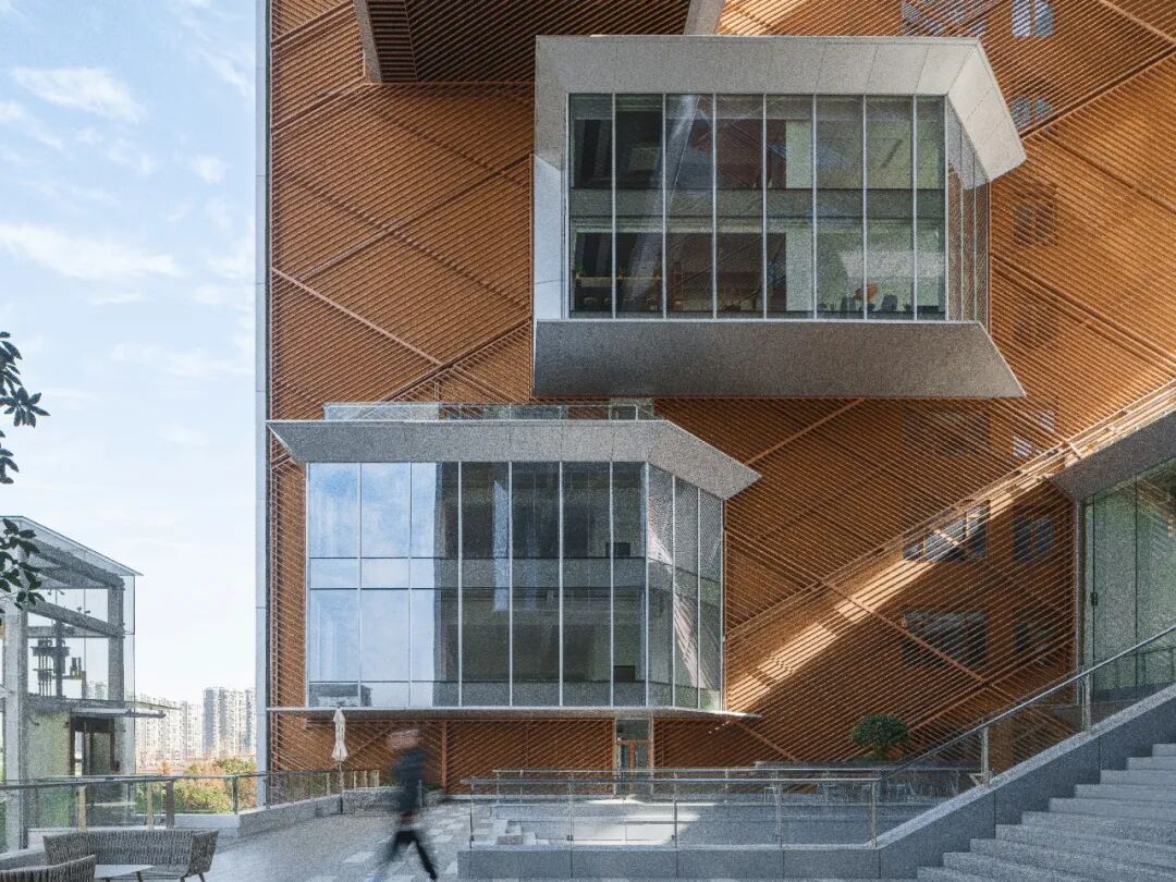 在建筑低区中,商铺立面、广场铺地、乃至景观家具小品,多采用明暗相间的像素格纹语言,通过大小和比例的变化,在统一中带层次感,创造出别树一格的都市气质。而中庭内壁采用了棕色的格栅材料,与浅银金属色的城市立面形成对比,勾勒出内核的轮廓。浅灰色的庭院大台阶嵌入了温度感的木质材料,为企业员工、浙大学子和周边居民塑造鲜活有温度的社区交流场所。