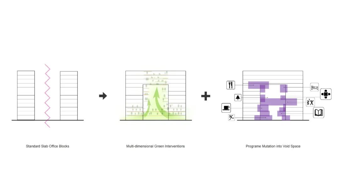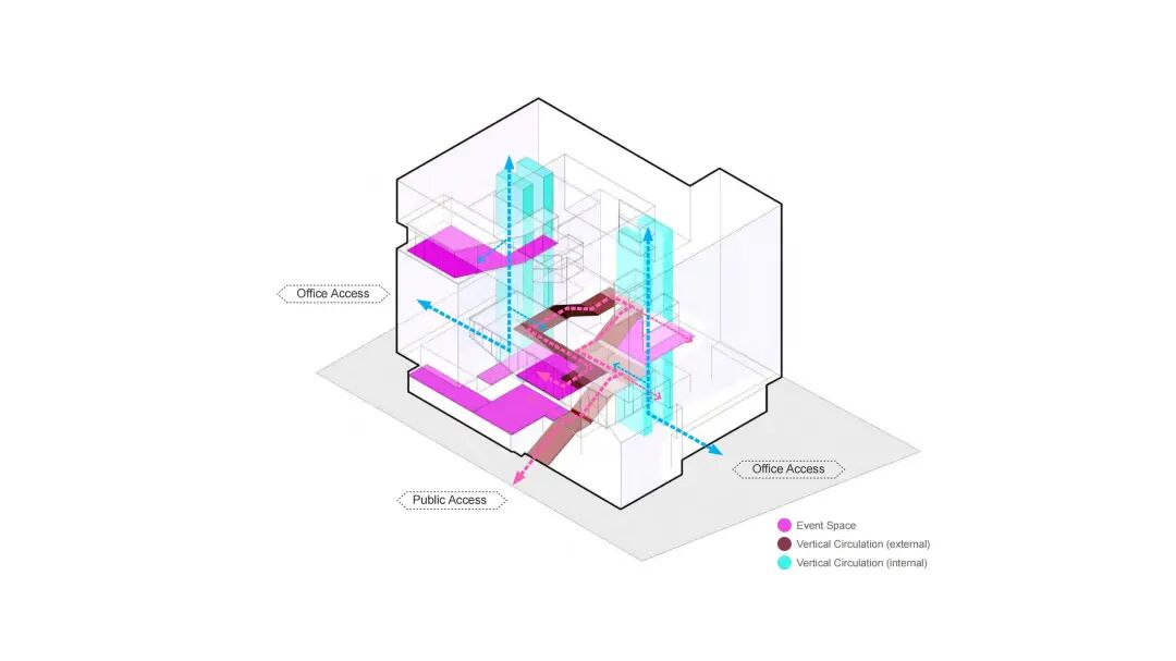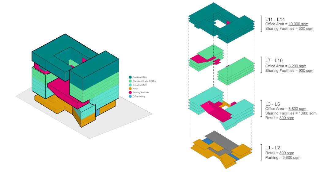 透过设计条件、用户及场地分析,设计团队从研究学术、商业和社区领域的共生关系开始,探索一个知识交流、社区互动及企业展示的公共场所。在60米的建筑高度限制和有限的地块面积下,以“共享融合”为核心理念,通过打开建筑空间的中庭布局,不仅提供优质高效的工作空间,更希望促进目标客群,如大型企业总部、中型企业、科技初创公司及大学周边共享办公的各种合作与互动,务求成为一个共享共创共生的新型办公综合体。