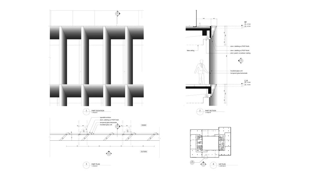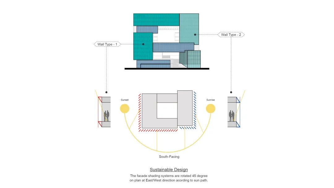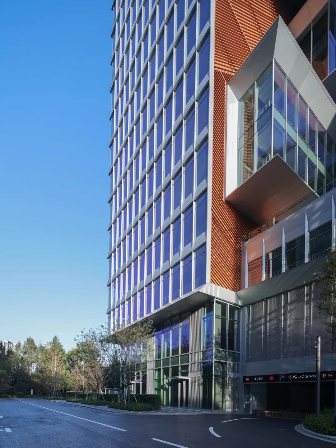 建筑从整体规划到幕墙设计都充分考虑可持续发展的需要,打开庭院不单为建筑内外空间提供了充足的自然采光和通风,有效降温省能,更为各层办公企业创造视线交流的可能性,贯彻互动空间的概念。外立面为窗墙系统,并结合了视野引导和太阳路径,令建筑更为节能环保。用于东/西立面的遮阳垂直构件45度旋转,和水平角度的隔层铝板,均可以控制太阳角度,减省能耗。
