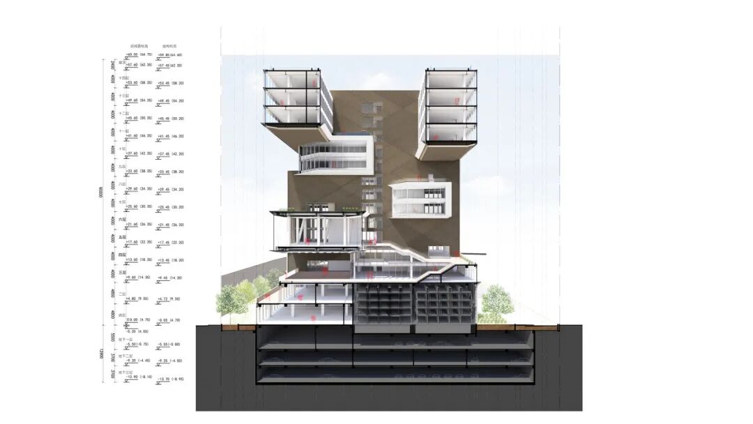通过垂直与水平空间的相互穿插,建筑形态由传统塔楼演化成交错堆叠的方块。办公空间沿基地东西两侧楼栋分层堆叠,并于高层创建闭环式相连的体量,灵活的布局与面积区间,满足不同规模和发展阶段的企业需要,并建构成多元化的办公用户社区。