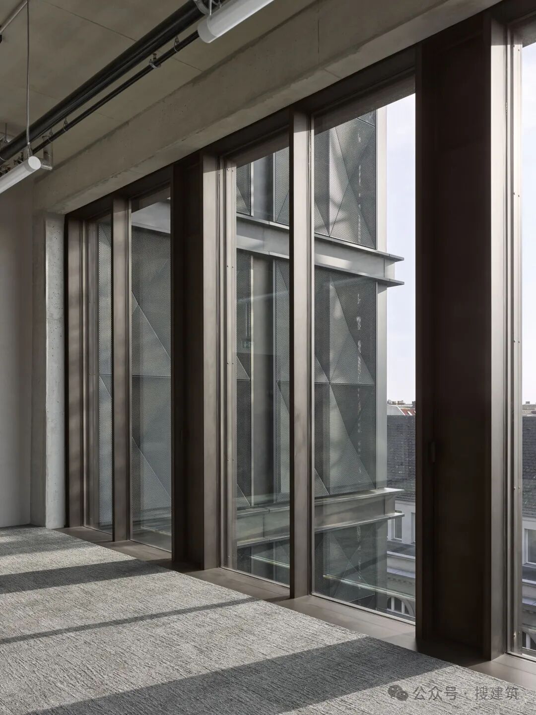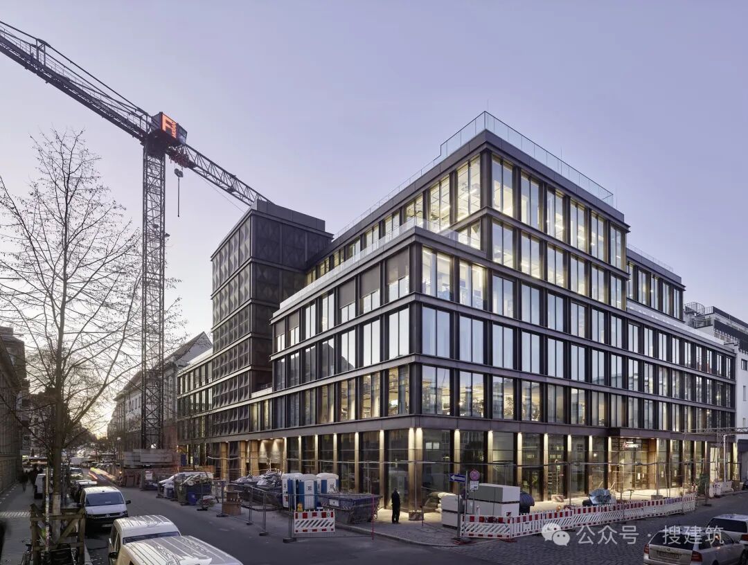 立面设计将综合体分为两个不同的部分:karl - marx Straße一侧设有明亮的石头凉廊,而Ganghofer Straße的前停车场则覆盖着青铜色的金属。旧的螺旋形停车坡道被改造成“冬季花园”——一个连接两座建筑的活动空间。重新设计确保更好地融入周围的建筑,同时使转变明显引人注目。