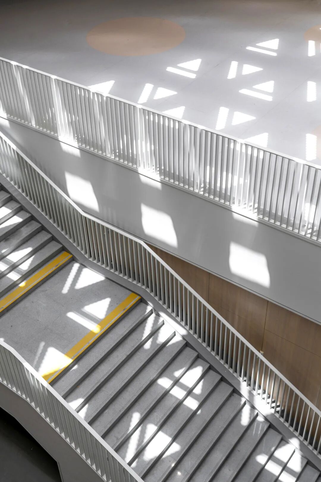 校园整体的素雅的浅灰色基调中,通过建筑形体的退叠、穿插、架空来搭建光影,浅灰色的穿孔板,铝板和木纹肌理的清水混凝土的运用则将不同的光影效果传递到室内。同样的色彩基调,不同表面肌理与质感,形成非常饱满的视觉体验。