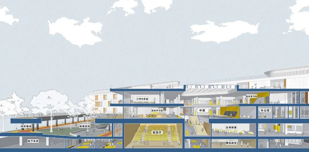 校园专业教室和各类大小的学术交流区围绕中庭集中设置,衔接南北,最大化预留绿色开放空间。