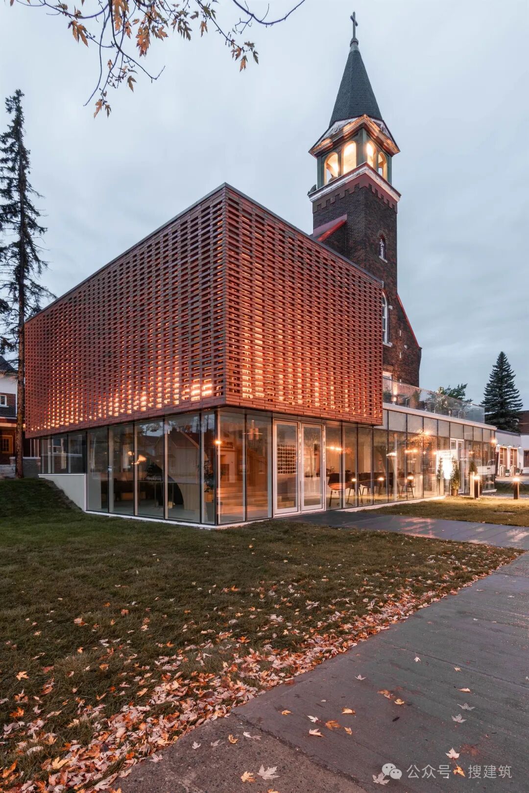 The Agora des Arts breathes new life into this heritage site, allowing it to continue serving as a vibrant cultural hub in the Abitibi-Témiscamingue region while honouring its historic and symbolic significance. The newly added suspended volume features a striking red brick façade arranged in a lattice pattern, juxtaposed against a transparent glass wall that allows a warm, inviting light to permeate the space and create a luminous aura in harmony with the building's original composition.