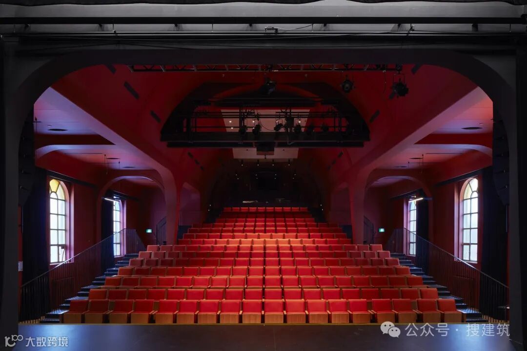 The symbolic staircase has been laterally repositioned within the church, seamlessly linking both foyer levels. This striking feature is showcased through the expansive glass walls of the first floor, while the richly crafted wooden staircase adds an imposing sense of grandeur to the Agora. Inspired by the polished wooden finishes of traditional church interiors, this staircase also acts as a gateway to the imaginative realm of performance, guiding visitors toward the auditorium.