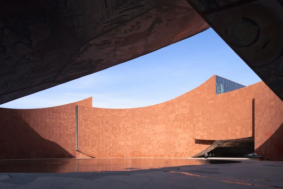 建筑的室内空间正是在这样的特殊的光线引导下展开的,建筑的主入口面向西侧道路,在两个体量相撞下,形成拱起的灰空间。这里可以直接看到环形结构中的庭院,顶部是由金属板彩绘吊顶呈现的麦积山石窟中的壁画内容,色彩既鲜艳又古朴,让人感到扑面而来的文化气息。