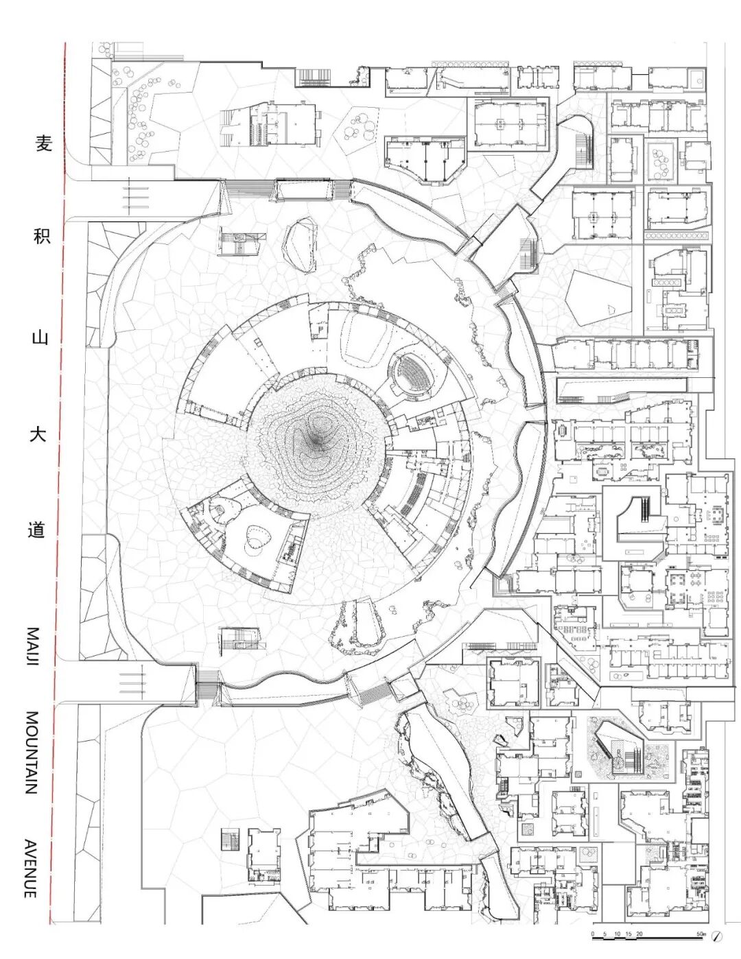 探讨麦积山文化及艺术的意义首先要思考佛教的影响,设计便由此开始。环形结构是人类意识觉醒后被用于仪式性空间和纪念性场所最常见、最原始的一类空间形态,它与佛家的轮回观念相对应。一切有生命的东西如不寻求“解脱”,就永远在“六道”中生死相续,无有止息。当然,这些观念及注解在历史长河中经过文化交融发生变化,尤其是在与汉民族原生文化产生交流及融合的过程中,甚至在现代化的过程中,它已经超越佛教本来的意义,有了更加当代性的解读,这将预示着可持续发展的现实主义力量并作用于我们的生活体验。