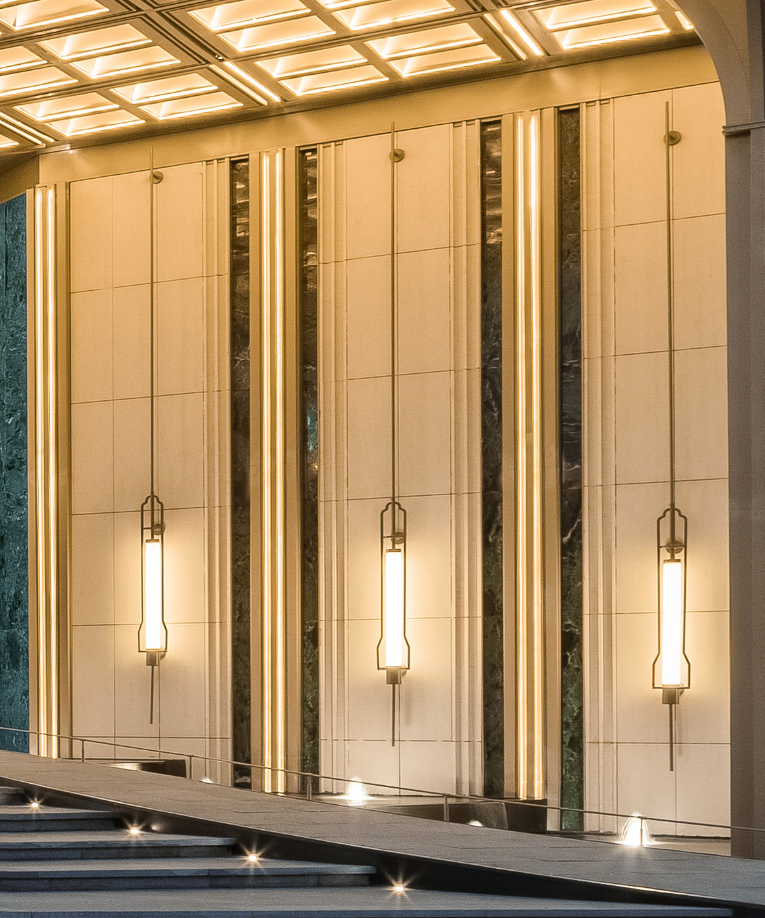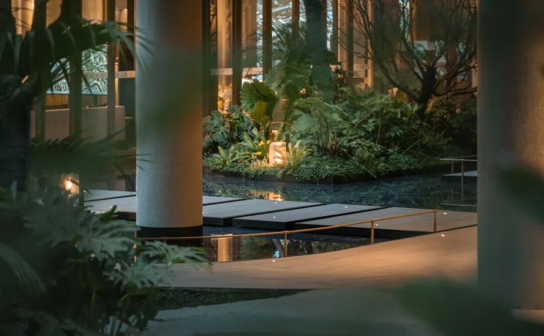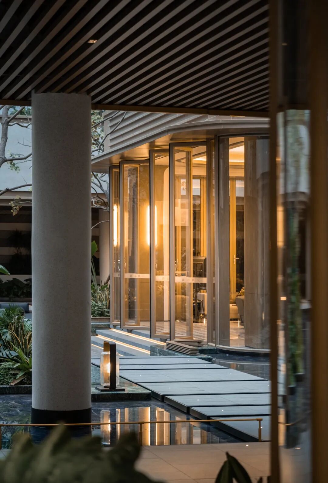 水景延伸至建筑架空层空间,以“绿植”渗透,以“浅滩”消化,以“水体”交织,透明玻璃窗消隐空间的边界感,在视觉上将空间无限延伸,实现了景观的室内联动,创造了一个无界、多维度、高价值的社交场域。