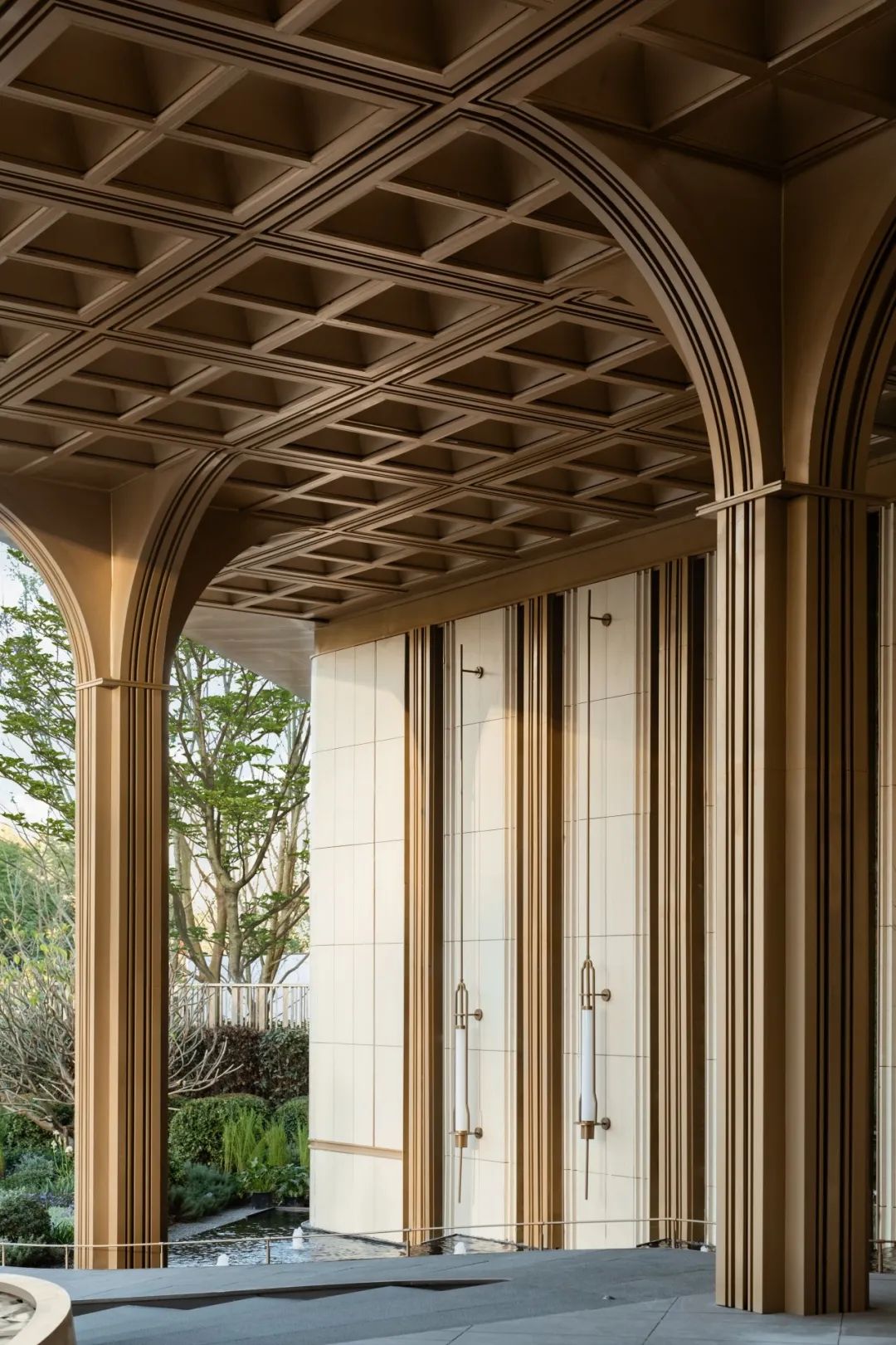 庭院水池的池底铺设翡翠绿仿石,隐约中,石面纹路如水波流转,奢而不耀。项目LOGO独家定制暗纹的黑白色地砖,从会所入口一直延伸到眺台处,尽显精工细节。