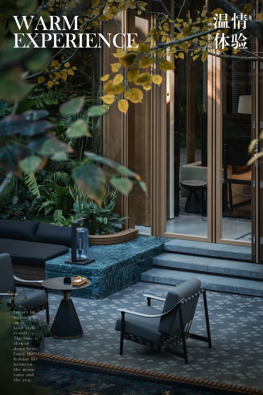 充满热带氛围的阔叶绿植环伺整个空间,丰富的植物搭配跌落瀑布带营造景观秩序,居者可在此感受时节交替、四季流转。高低错落的景致,让人仿佛置身于自然中,演绎松弛治愈的度假体验。