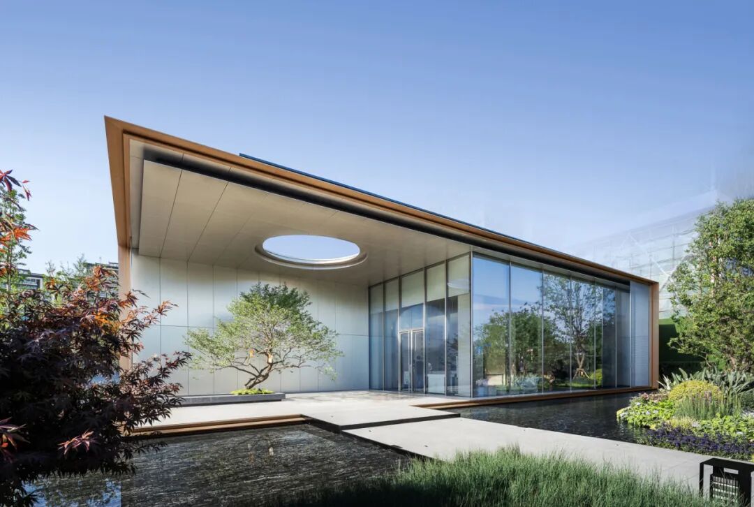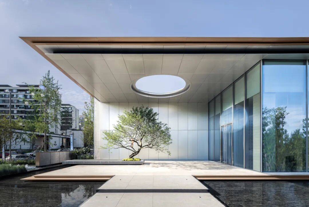 先期建成的示范区作为整个项目的缩影,延展了项目的整体设计理念,着眼于尺度的把控与韵律营造。整个示范区作为城市界面的标识性形象,空间格局就此打开。在入口灰空间的处理上,设计充分回应了宋式美学对空与透的追求,留白的圆形穹顶下矗立着一株翠树,自然形成一幅天人合一的禅意野趣之景。