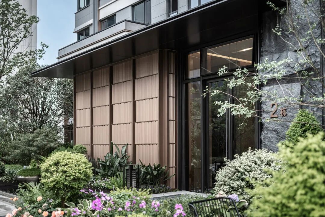 商墅的立面通过采用大面积的玻璃和金属材质,营造出通透而现代的居住氛围。通过如金属格栅和石材的巧妙运用,兼顾了与城市风貌的协调。