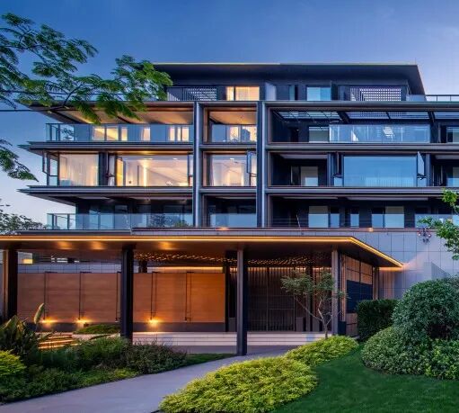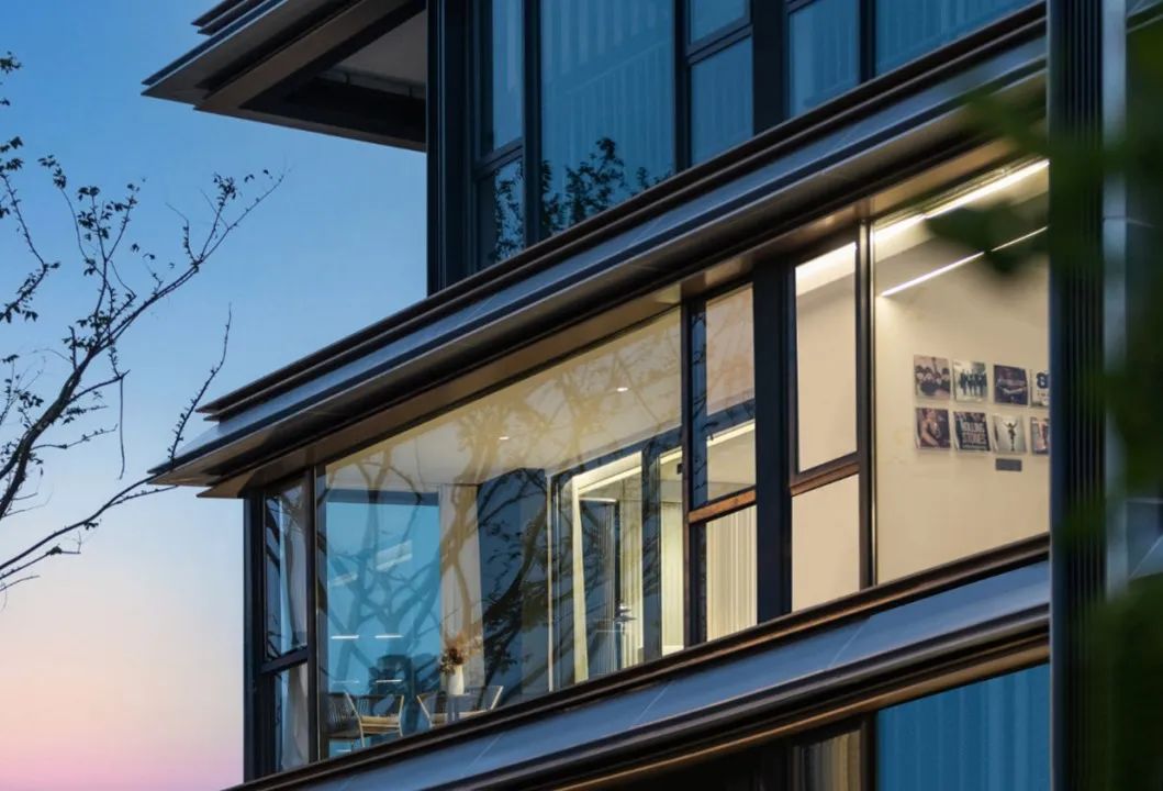 建筑的主要纵墙面,包括封闭阳台,全部采用类玻璃幕墙的细部做法,框体边缘的线条截面尺寸控制在极致的2公分,同时用纤细的香槟金铝合金装饰窗套勾勒出景窗的轮廓细节,整体上呈现连续而通透的立面形象。