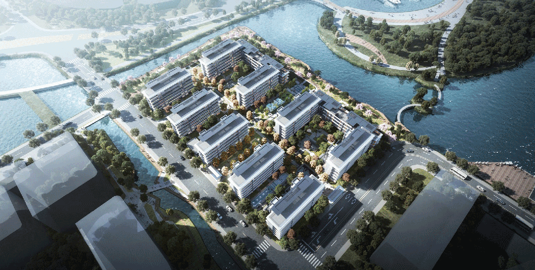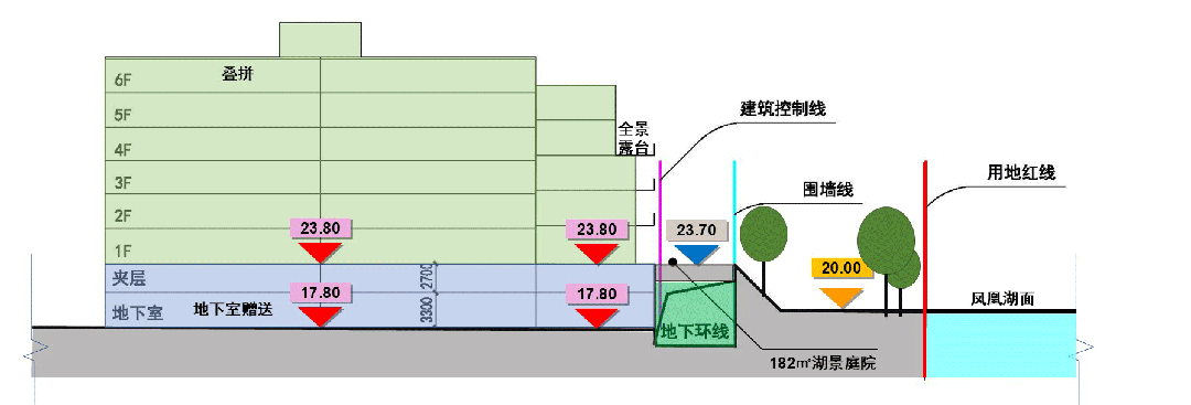 规划设计将住区基底相较沿湖景观驳岸整体抬高了3.7m,拥有了全景视野。