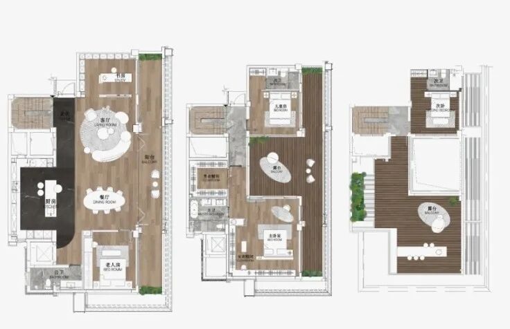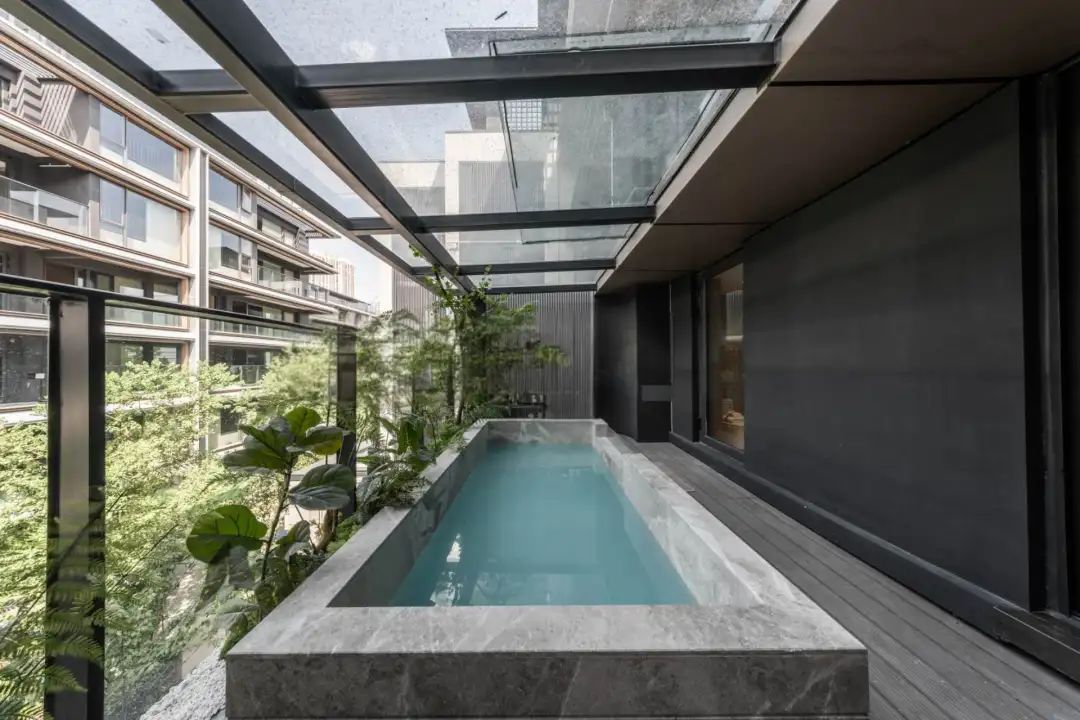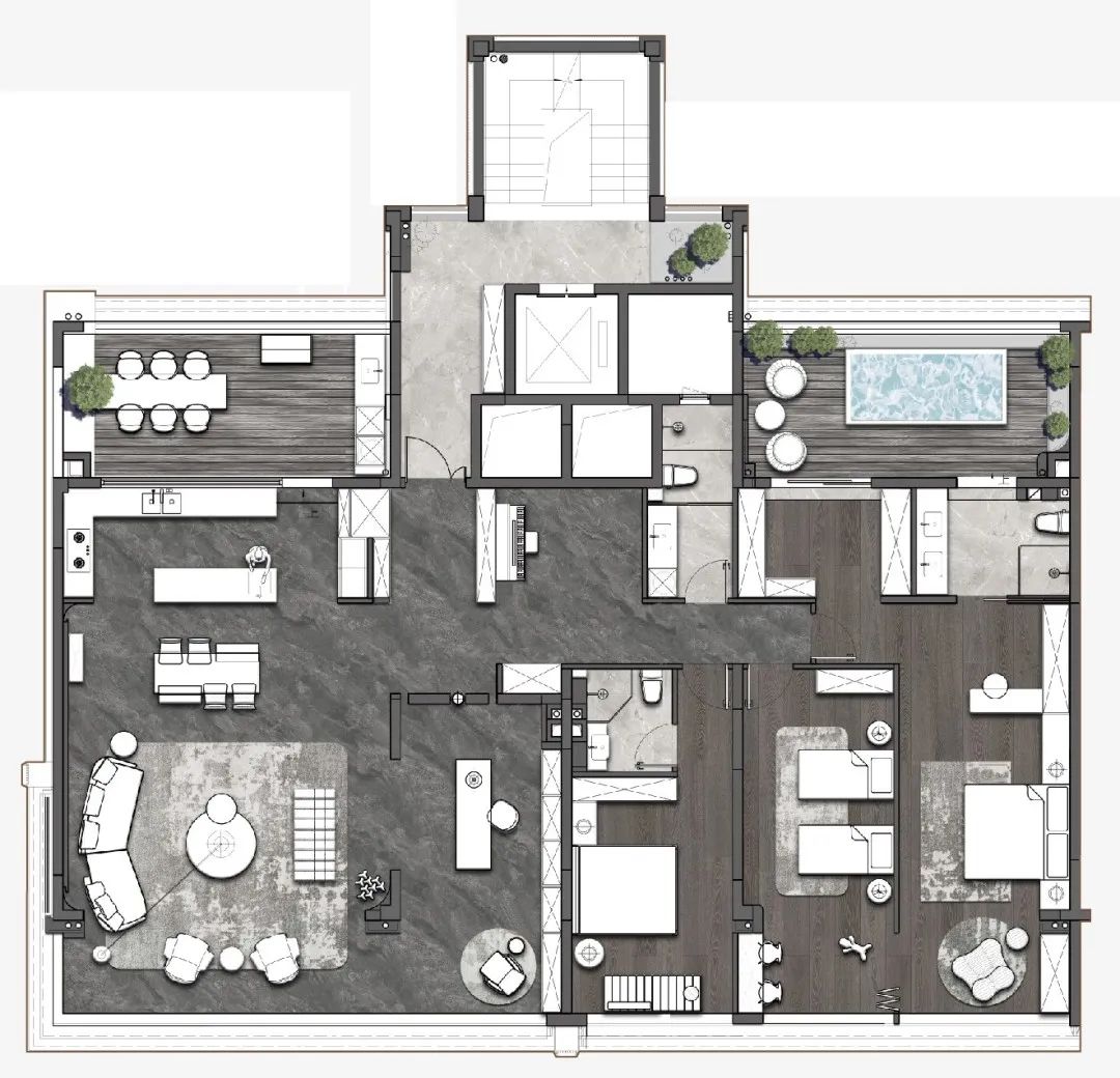 亮点二,“超级大平层”,平层产品为一梯一户大面宽产品,南向面宽达到了20.2m,而产品北侧利用日照退让形成了与厨房等公区相连的情景露台,以及与主卧空间相邻的泳池露台,实现了产品南北向面宽的最大化。