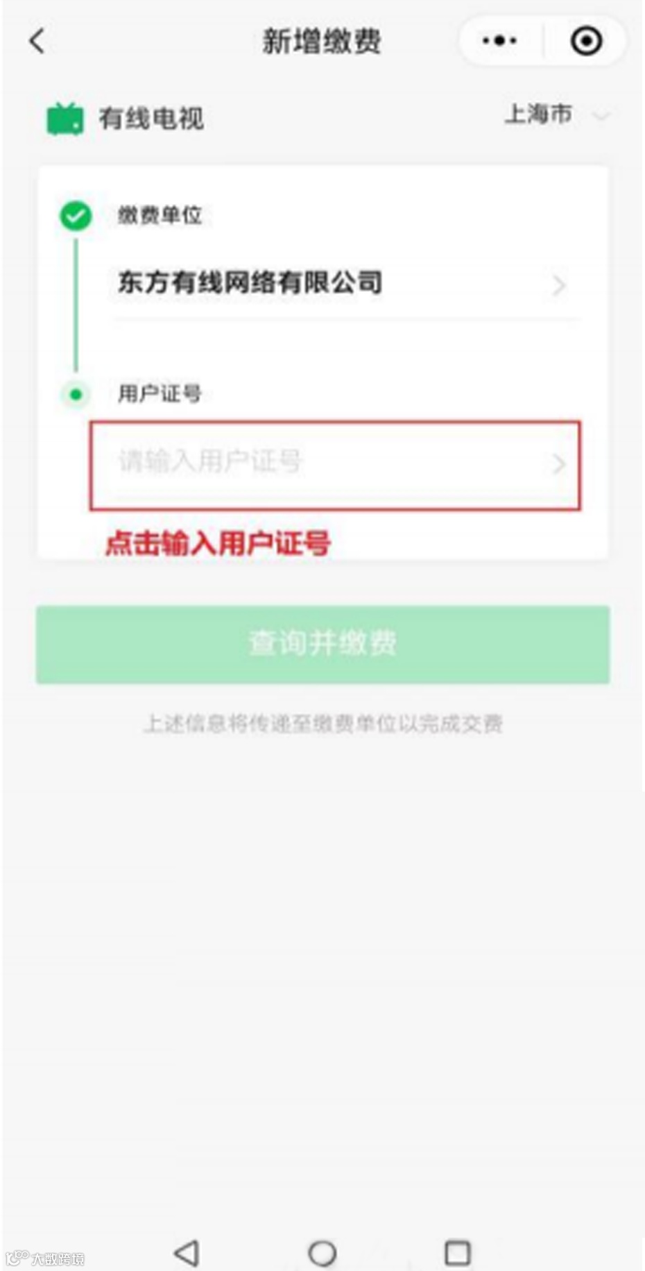 缴费单位:东方有线网络有限公司;用户证号:输入 11 位的用户证号。
