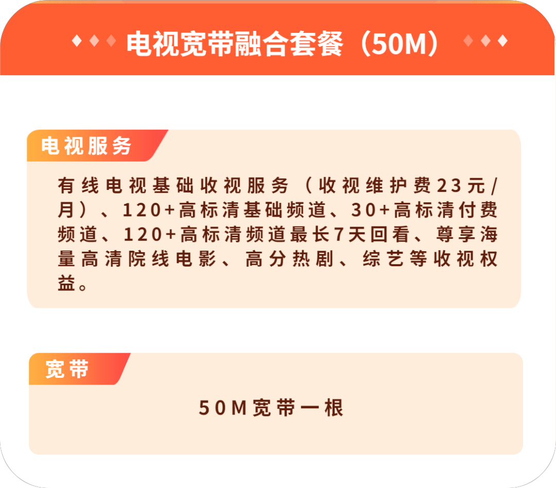 电视宽带融合套餐(50M)原价696元,双十二钜惠仅需432元!