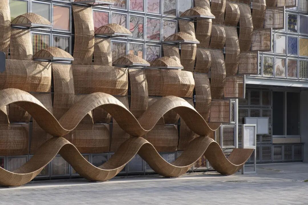 The pavilion's design draws inspiration from the art of Filipino weaving, which aims to symbolize interconnection and resilience. Its architecture mirrors the structure of "warp and weft," representing unity, strength, and progress. Constructed with over 1,000 rattan threads and featuring 212 handwoven panels, the pavilion elevates traditional weaving into an architectural scale, creating a structure that expresses continuous progress with symbolic extending threads. These panels, created by local artisans from communities across the Philippines, are a tribute to the country's weaving heritage and showcase the diversity of its 18 ethnolinguistic regions. By scaling traditional weaving techniques to an architectural level, the pavilion aims to showcase the relevance of Filipino craftsmanship in a contemporary context.
