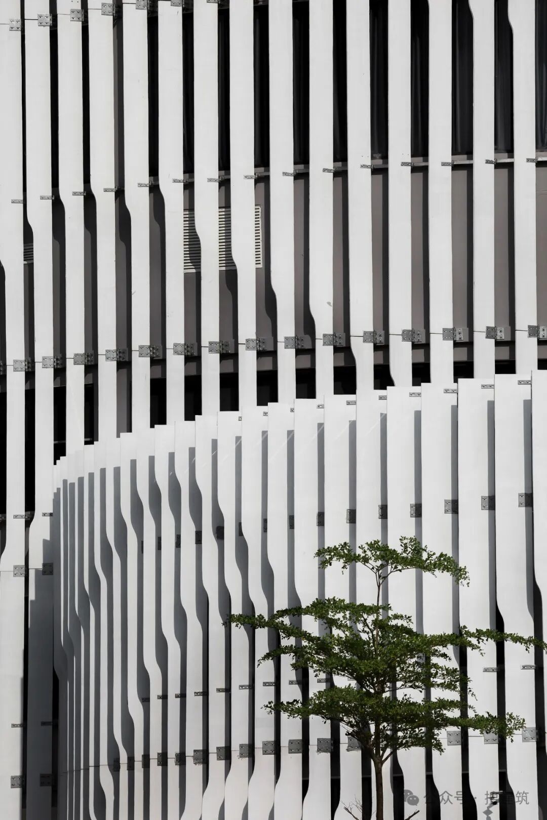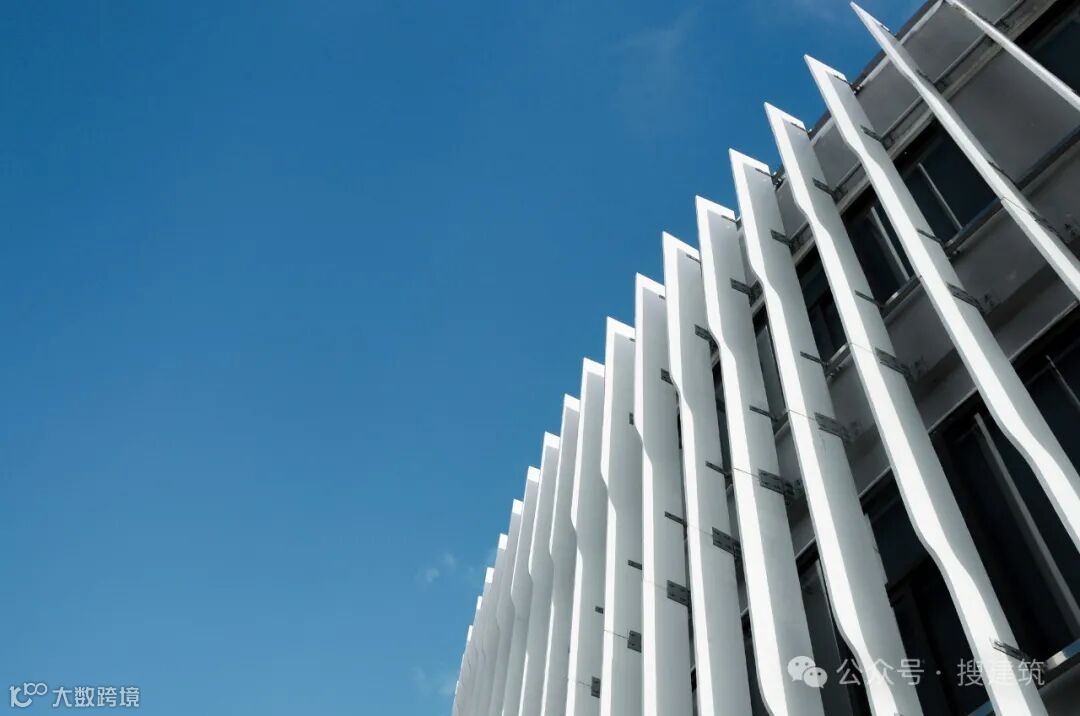 由于建筑的动态形状,能源模拟软件被用来开发用于防晒的参数化鳍片立面系统。每个鳍片的角度都经过了优化,以减少太阳辐射热量和眩光,同时还允许自然光和人员工作区的视野。通过对鳍片轮廓的柔性处理,整个外墙呈现出波光粼粼的涟漪。室内的天然木质镶板也体现了这一理念。