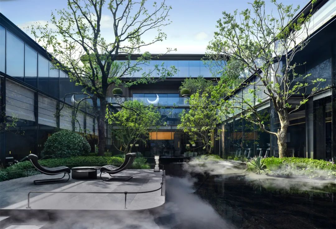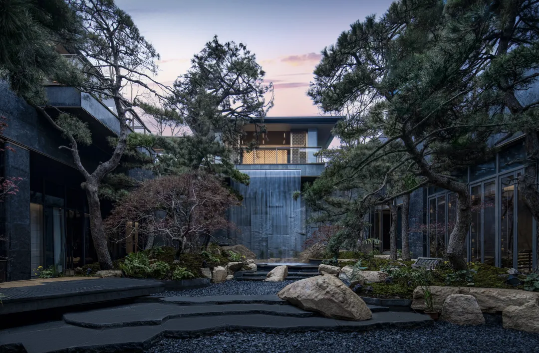 这里每一块柏坡黄原石都是通过人工精挑细选,保留天然质感,自然排布于碧池驳岸,每一棵油松都有超百年的树龄,加起来超千年,并且每一棵树价值不菲,一池、一松、一瀑、一石,营造出清朗明洁的下沉庭院空间。