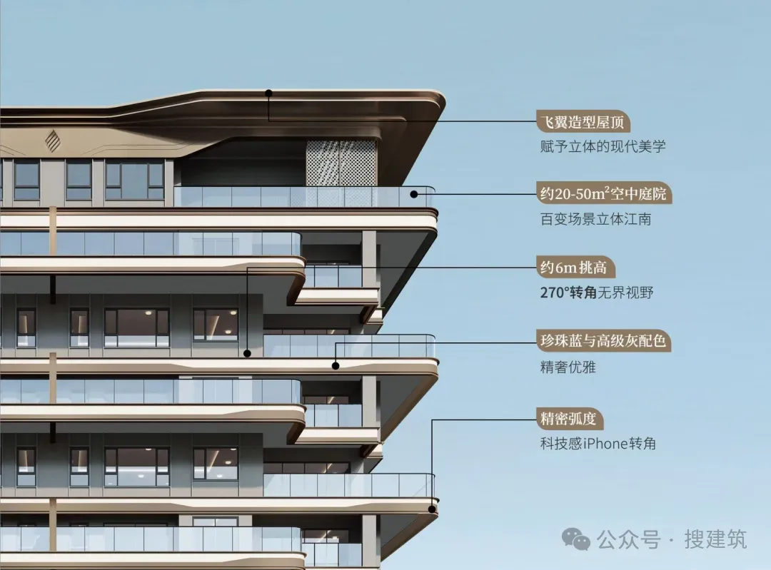 大师立面:其屋顶呈飞翼造型,转角有着如同 iPhone 般的精密弧度,尽显精奢优雅之态。