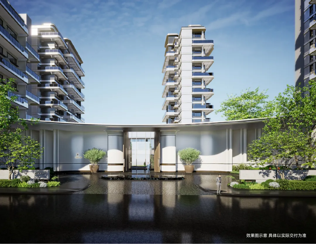 约 80m超大尺度的景墙以及蓝翡翠奢石照壁呈现眼前,给予你酒店落客式的尊享归家体验。