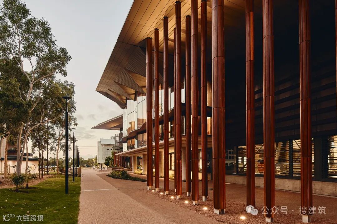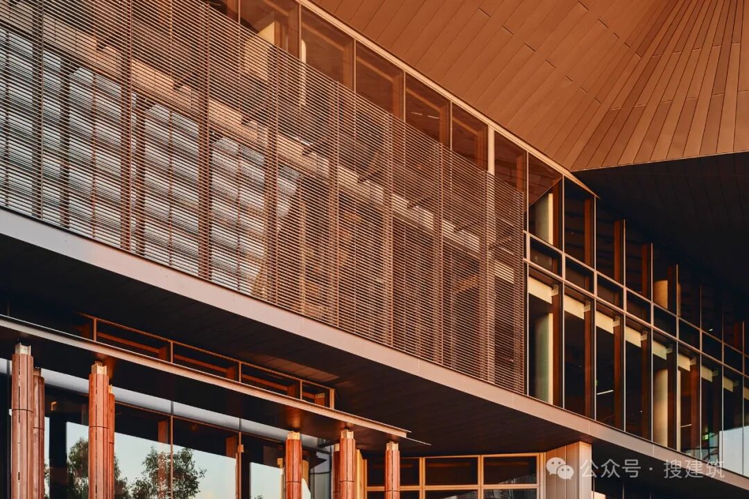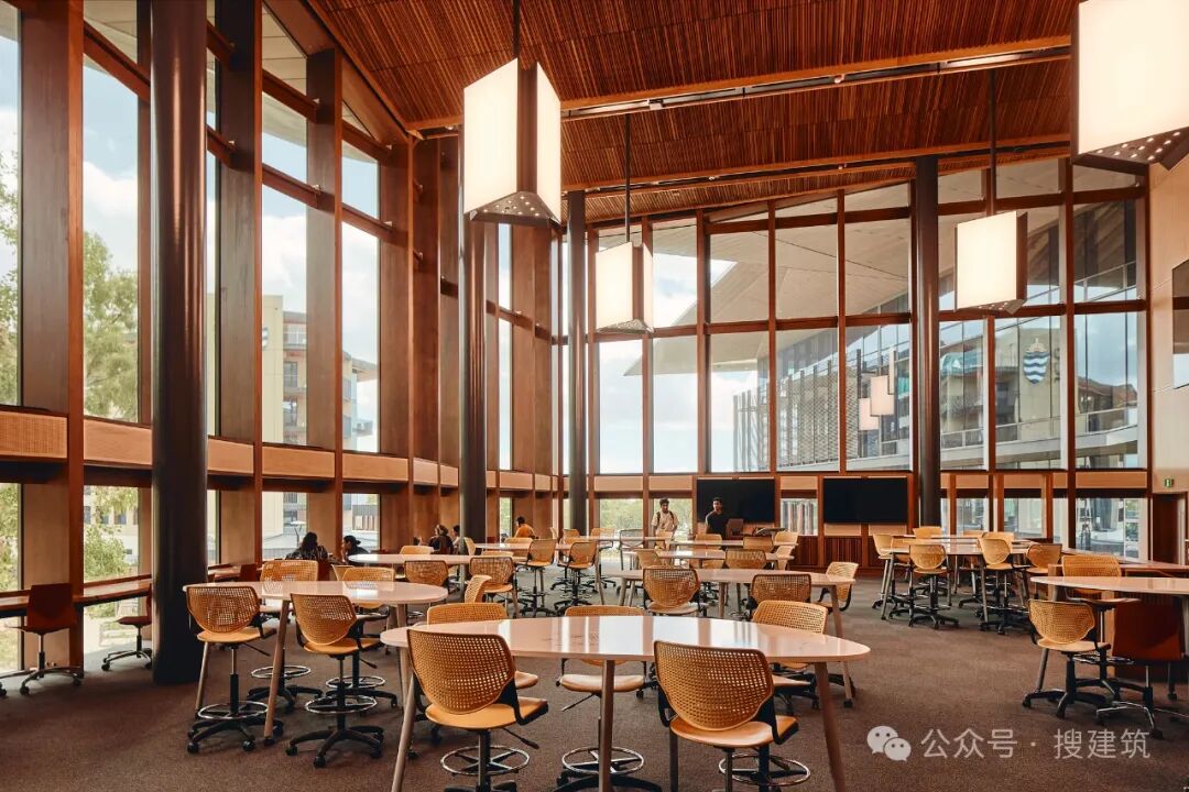 建筑立面采用了创新的混合胶合木(GLT)系统,带有抗碎片冲击的玻璃,既提供了热性能,又提供了抗旋风冲击碎片的能力,而不需要传统的防护屏障。这反过来又支持了充足的采光和透明度——这对热带环境来说是一个挑战,但对教育设施来说却是必要的。结构实验室包裹在定制的耐候钢百叶中,为通高空间提供永久通风。这种材料提供了一种独特的、识别性的表达,让人想起当地景观的丰富色调,并庆祝JCU与工业的联系。耐候钢的设计是随着时间的推移而氧化,它提供了一个耐用、坚固、有弹性的外壳,既具有渗透性,又具有保护性,确保了持续的弹性。