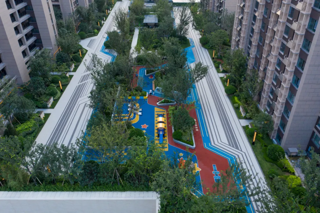 通过创新规划,将社区花园抬高6米,通过三个天桥将东西两侧地块连接,形成既开放又私密的立体社区,上层居民独享5万平米园林绿地、下层为开放式广场和商业配套,解决了地块被城市道路割裂问题,保证了居住体验的同时,下层商业配套功能也大幅提升了生活的便利性、丰富性。