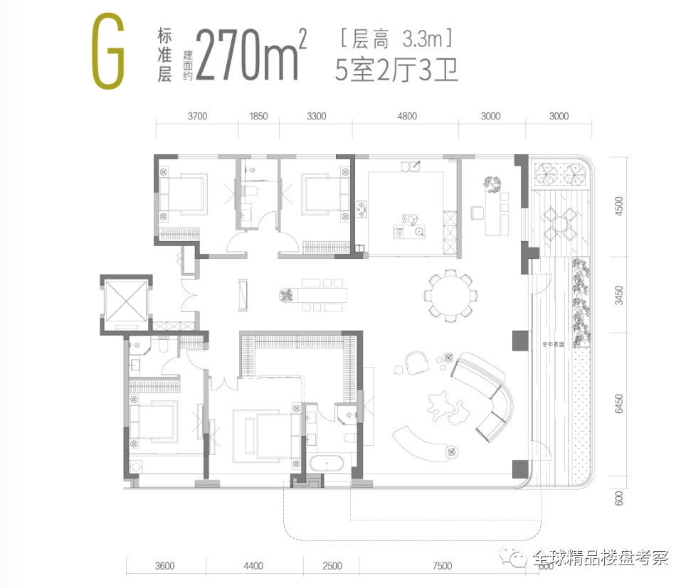 按照空中别墅的思维打造顶层产品,将别墅产品的庭院、挑空、大宽厅、户内电梯等优势特点融入顶层户型设计中,打造了顶层户户挑空带院的全新户型产品。