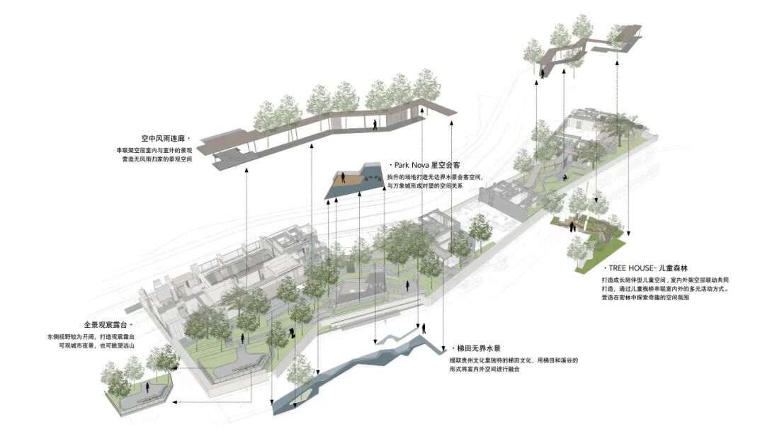 景观设计倡导无界架空层的空间构建,从贵州独特的梯田文化中汲取灵感,运用梯田与溪谷的形式,实现室内外空间的无缝融合。