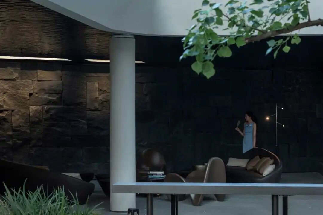 作为项目的一大设计亮点,抬升的场地与无边界水景会客空间相结合,形成了与万象城相对望的独特空间关系,提升了整体的视觉和体验效果。