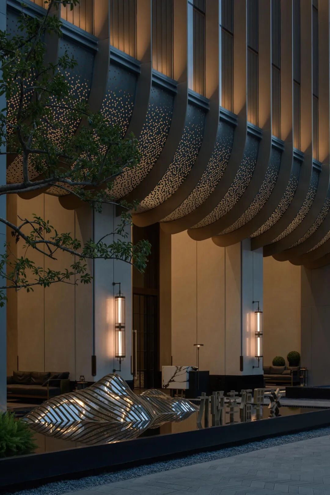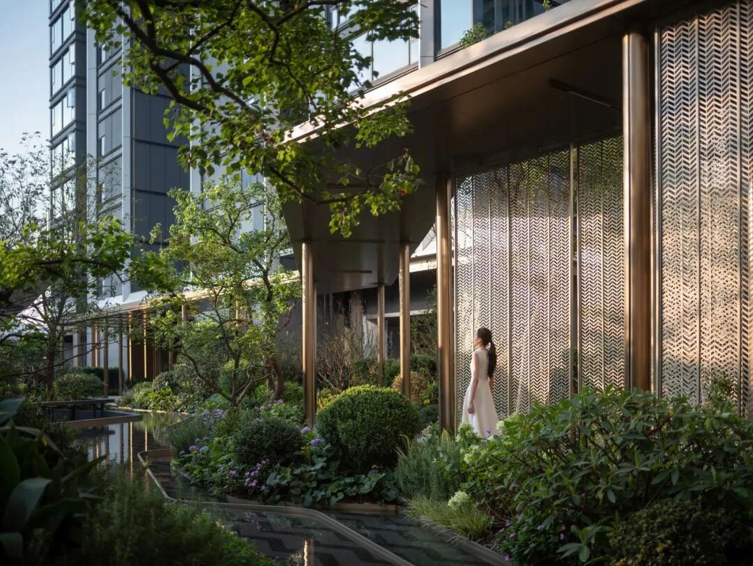 大气高级的建筑立面设计犹如山间悬瀑倾泻而下,入口造型绿植结合雕塑水景,营造出酒店般的精致格调。整个空间氛围气势恢宏且高级奢华。