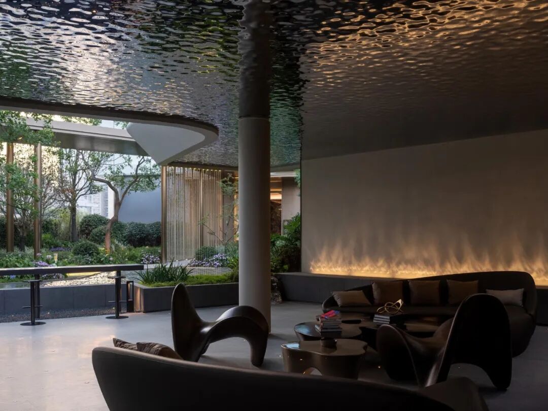 抬升场地,打造一个高品质的星空酒廊会客空间,而下层则设置了一个半私密的区域,营造出岩洞瀑布跌落的独特景观——山涧溪谷。