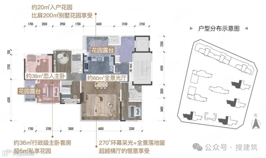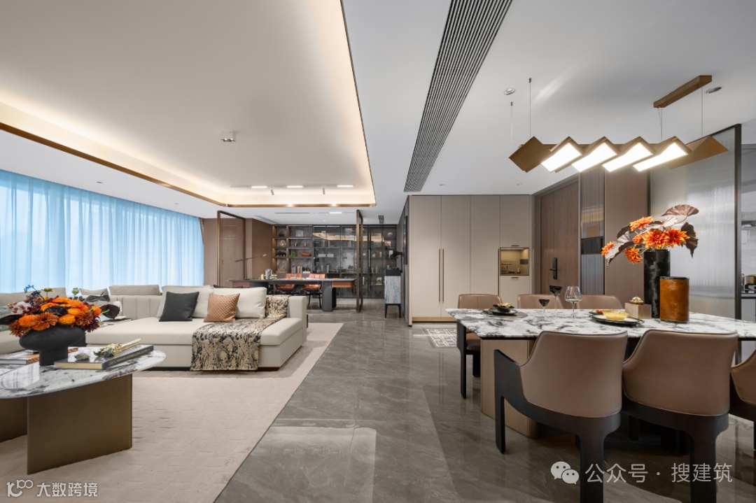 约20㎡入户空中花园,实现了双入户动线。室内约270°全景社交光厅,客餐厅为约7.2*6米,形成一个面积约42㎡的家庭社交场域,增强居住空间社交属性的同时为室内带来无限采光。
