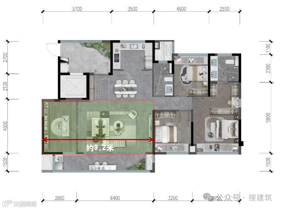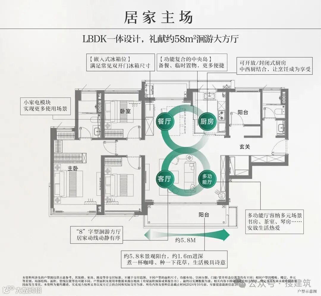 再比如,成都绿城·锦海棠小高建面143㎡户型,5面宽朝南。2.8米的X空间与6.4米的横厅长向连通,可以形成一个面宽超9米的LDKG厅。