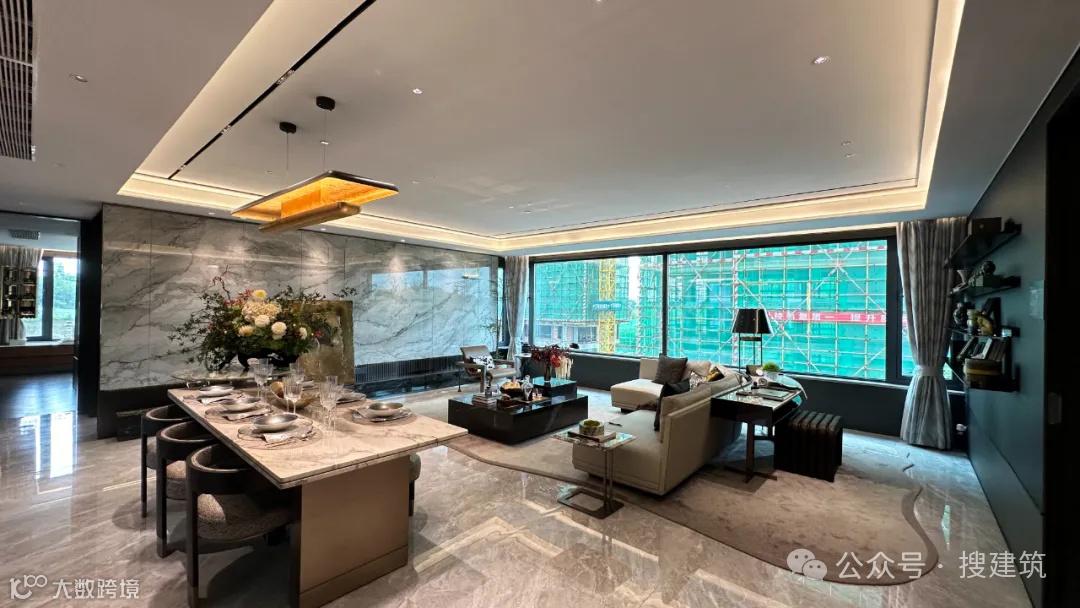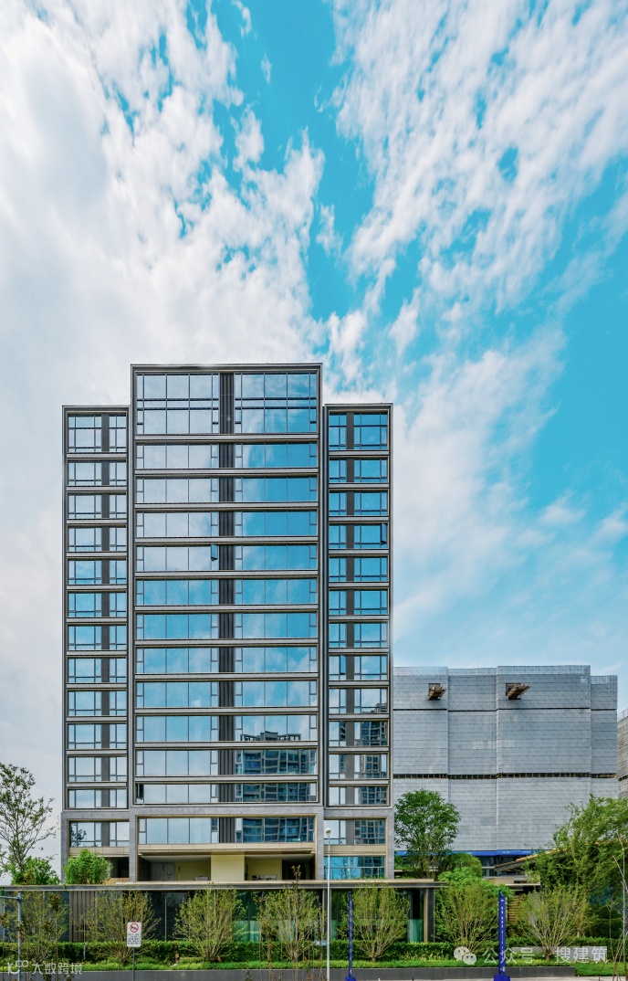 再来看成都龙湖观萃大面积巨幕落地玻璃,环绕四周取代实体墙面,下挂玻璃栏板外包结构,不仅引光景入室,形塑通透敞朗的空间感,更模糊室内外界线。