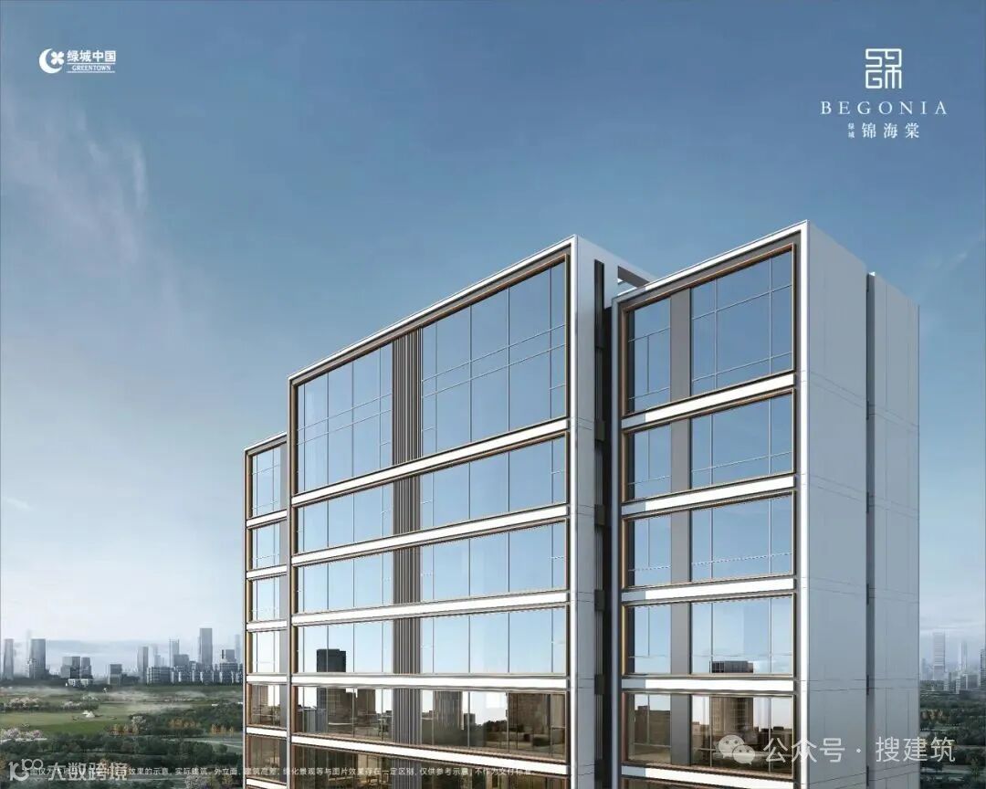 绿城为成都独创的“锦画框”外立面,大面的落地玻璃窗、横向拉通的玻璃栏板结合琉璃金线条边框,让建筑四面就像镜子,镜幕立面让建筑变成了玻璃盒子。