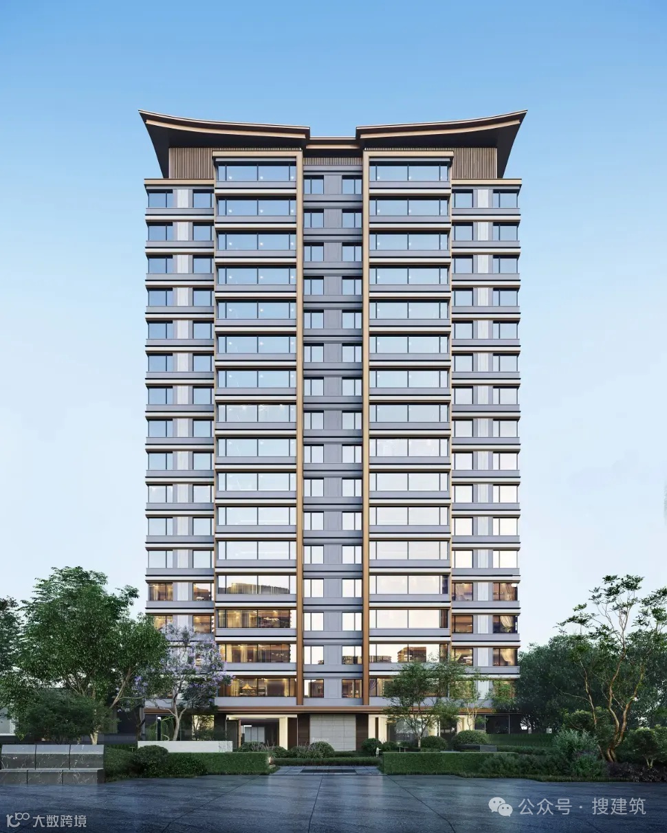 成都保利天府瑧悦建筑上采用全板式的1T2和2T2,外立面造型玉琮飞鸟悬浮设计。立面设计以玉琮纹理为美,冠顶部分提取东方传统凤鸟翼形态,整体结合在地化川西特色穿斗建筑。大逻辑框用香槟色点缀,视觉上的层次感更加强烈。