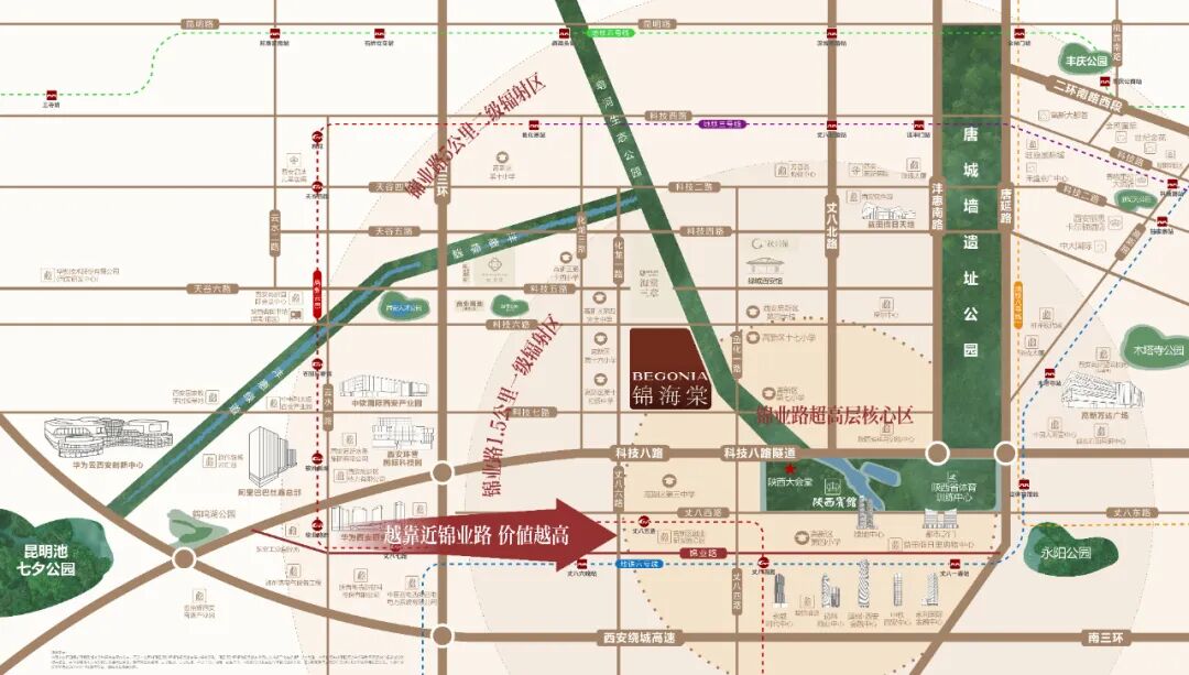 项目落位于中国西部经济发展与科技产业的前沿领地——西安高新区的核心位置,周边锦业路CBD、唐延路CBD与丝路软件城环绕;与陕西宾馆对望而立,这里是高新区33年来的动力之源;更有难得兼备的生态资源;且高度汇集了商业、教育、医疗等城市资源。