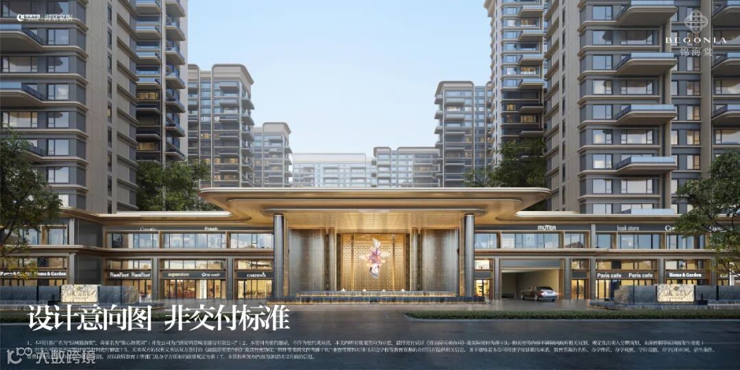 拉近来看,大门采用中心对称式设计,甄选定制的海棠花雕塑以华贵之姿立于叠水之中,成为了最引人注目的地标艺术。