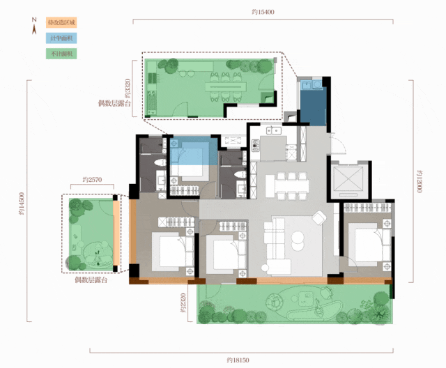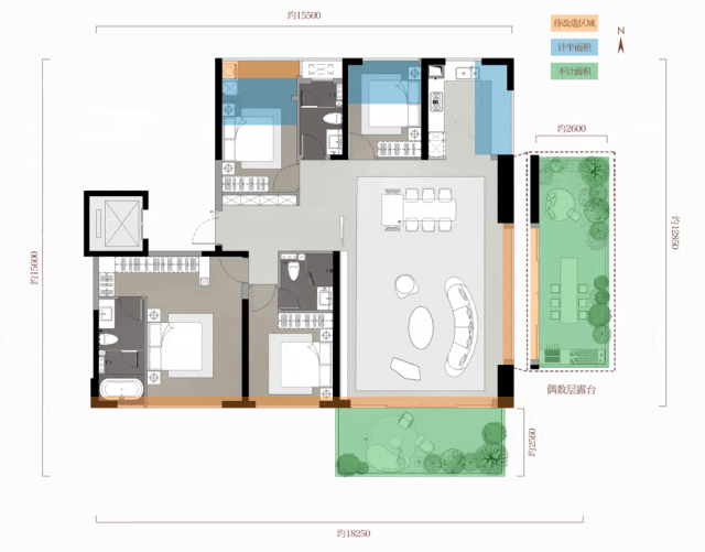 更大的开间、更灵动的布局、更舒适的南向面宽、更可观的使用空间,功能性和尺度感都实现了越级享受,「空中庭院」作为其最大亮点,采用露台外伸、奇偶层错位的布局,实现采光、观景的“平权”,达成户型的均好性。