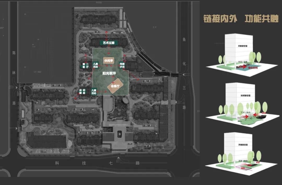 与其相辅相成的约800㎡六大主题架空层,其点晴之笔在于实现对功能的全面延伸:儿童乐园、成长天地、颐养静室及艺术长廊等空间营造,实现艺术与自然的共融。