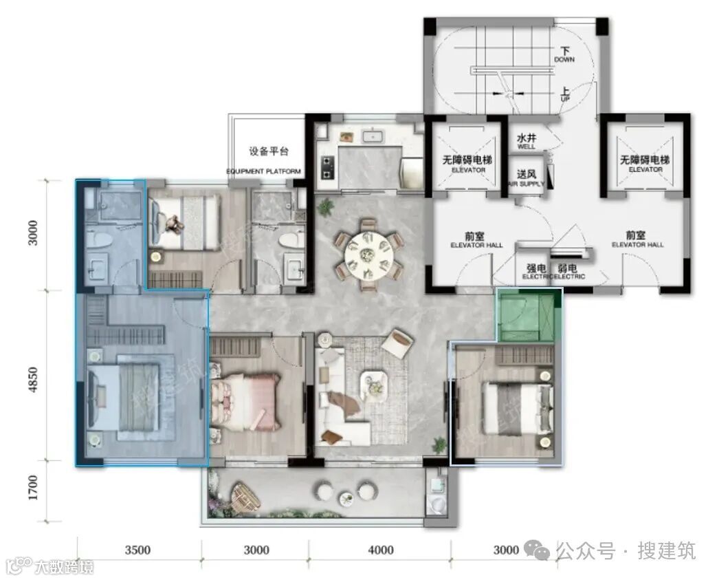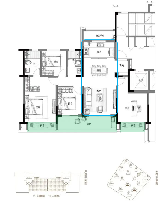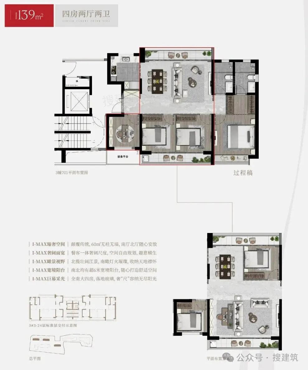 中间套的建筑面积约139㎡,则提供了另一种选择,其最大特色就是四开间朝南,并连通一个双开间的大阳台,整体呈现黄金分割比例的“刀锋”户型。