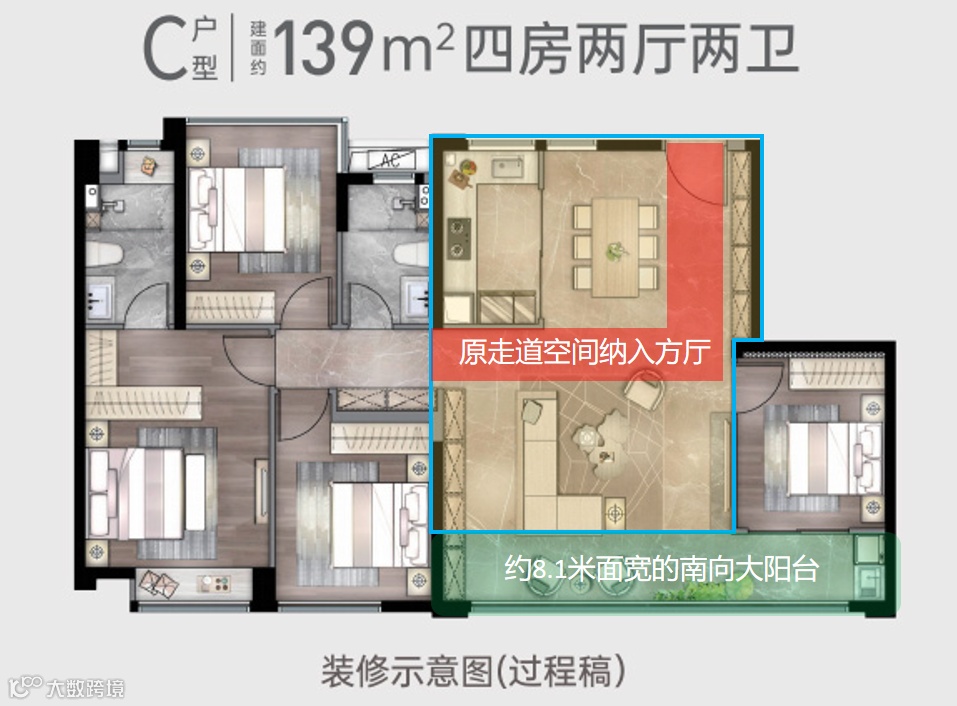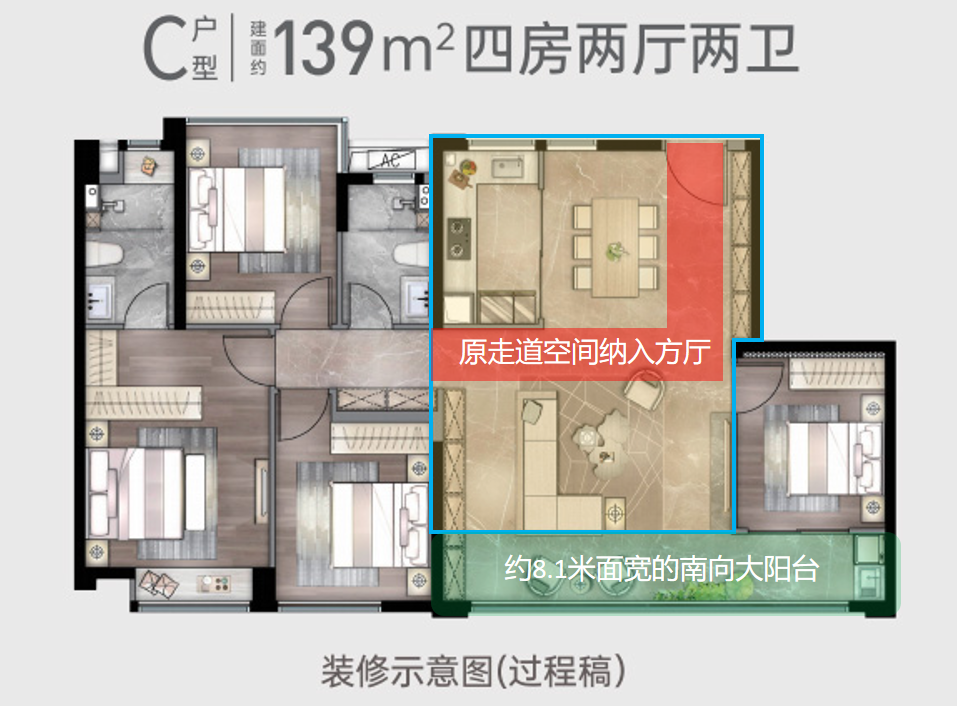 台州中盛·悦江府建面约139方的4房主力户型,三重场景设计,可谓层层递进。首先,南向大开间设计,约12.75米的惊人面宽,让所有房间都能沐浴在阳光之下,其次,南北面都是双联大阳台,景观面做到了极致。