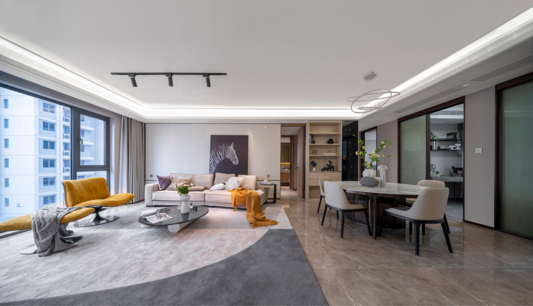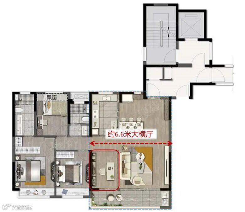 该户型还拥有约60㎡方厅设计,没有任何柱子或者承重墙,能基于一线瞰江的优越条件,以及家庭生活的需要,自由设计各类场景。