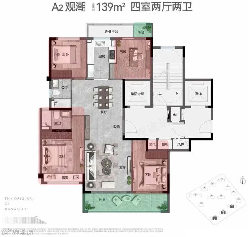 杭州伟星·星瓒颂锦府建筑面积约139㎡,分边套和中间套两种互补户型。