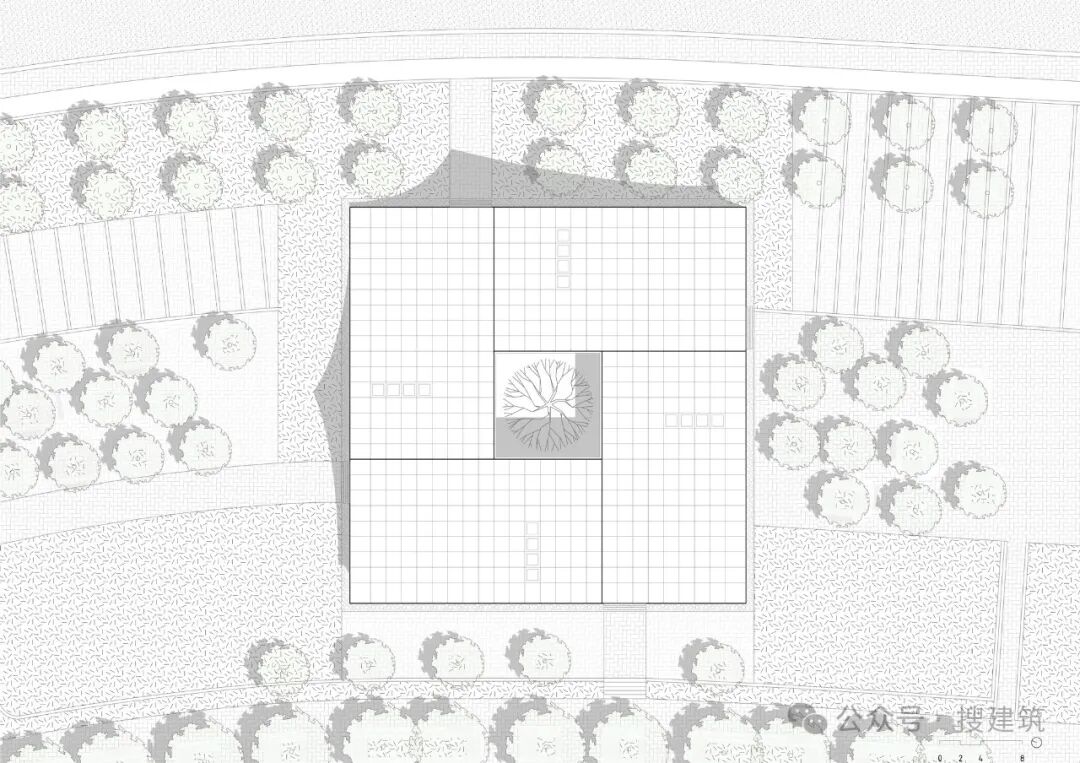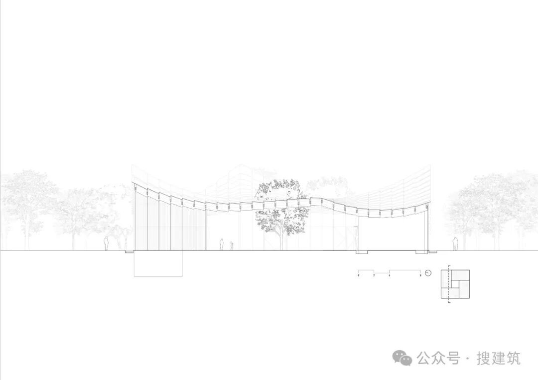 建筑的屋顶在边缘轻轻上扬,形成宽敞的双层通高入口,引导游客移步中央庭院,庭院中央的树成为空间静谧的中心。游客可以从驿站四处的任意一个开口进入到庭院,每个区域都设有独特的功能,分别为咖啡厅、精品店、餐厅和游客中心。屋顶结构以两层穿孔遮阳元件为特色,外层与玻璃组件融为一体,内层构成天花板,将周围环境引入展馆内部。两者结合在一起,既能让人瞥见天空,又能让日光透过穿孔照射进来,在一天中投射出光影图案。